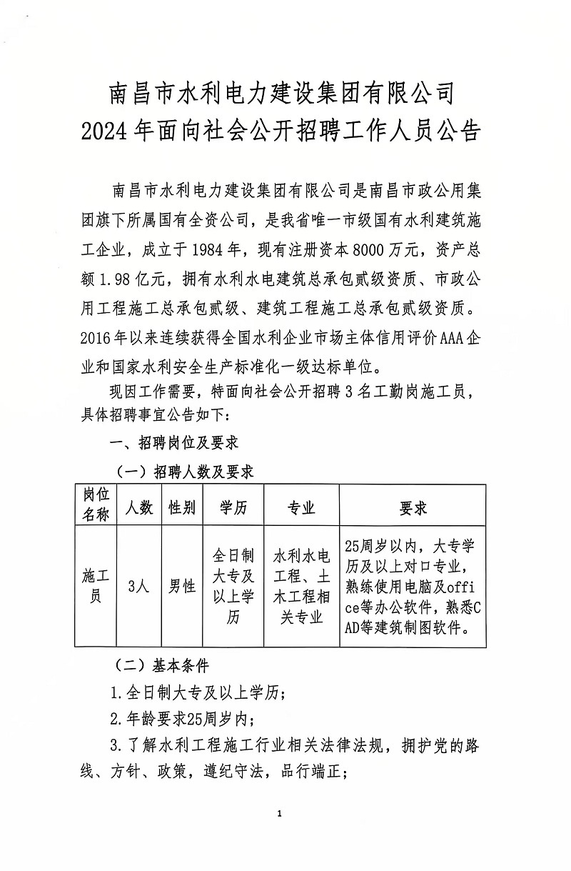 南昌市水利電力建設集團有限公司2024年面向社會公開招聘工作人員公告